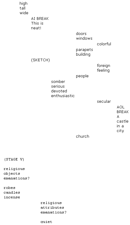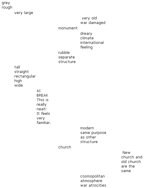 Viewer's Summary: Site is composed of two churches. One church, which is old and made of hand-hewn stones, has been damaged by war. There is a lot of rubble around it. The new church is very modern in design. Both are located in an area with a cosmopolitan atmosphere and an international flavor. The older church as been left as a monument to remind the people of today of the war atrocities of the past. The new church now serves the same purpose as the older church did at one time--a house of worship.